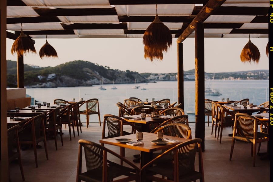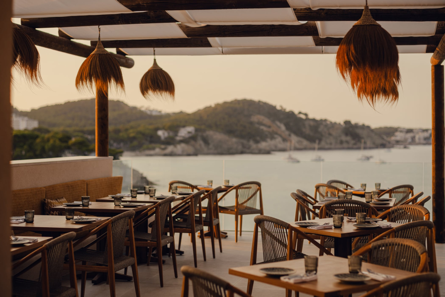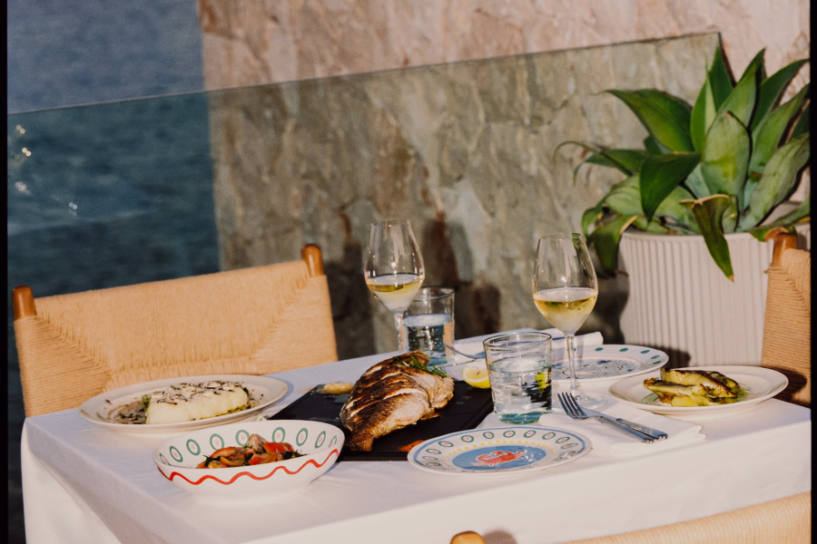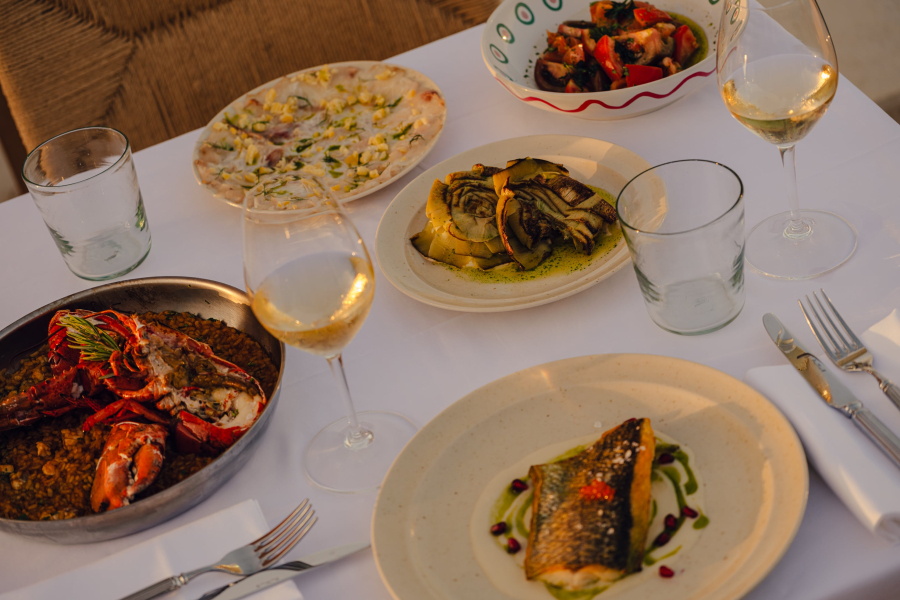 As the light fades, the space shifts into a more intimate setting, where long dinners unfold overlooking the sea.